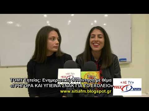 Η Τοπική Μονάδα Υγείας Σητείας, σε συνεργασία με το Ελληνικό - Μεσογειακό Πανεπιστήμιο - τμήμα Διατροφής και Διαιτολογίας διοργανώνει ενημερωτική συνάντηση με θέμα «ΓΡΗΓΟΡΑ ΚΑΙ ΥΓΙΕΙΝΑ ΣΝΑΚ ΓΙΑ ΤΟ ΣΧΟΛΕΙΟ»,